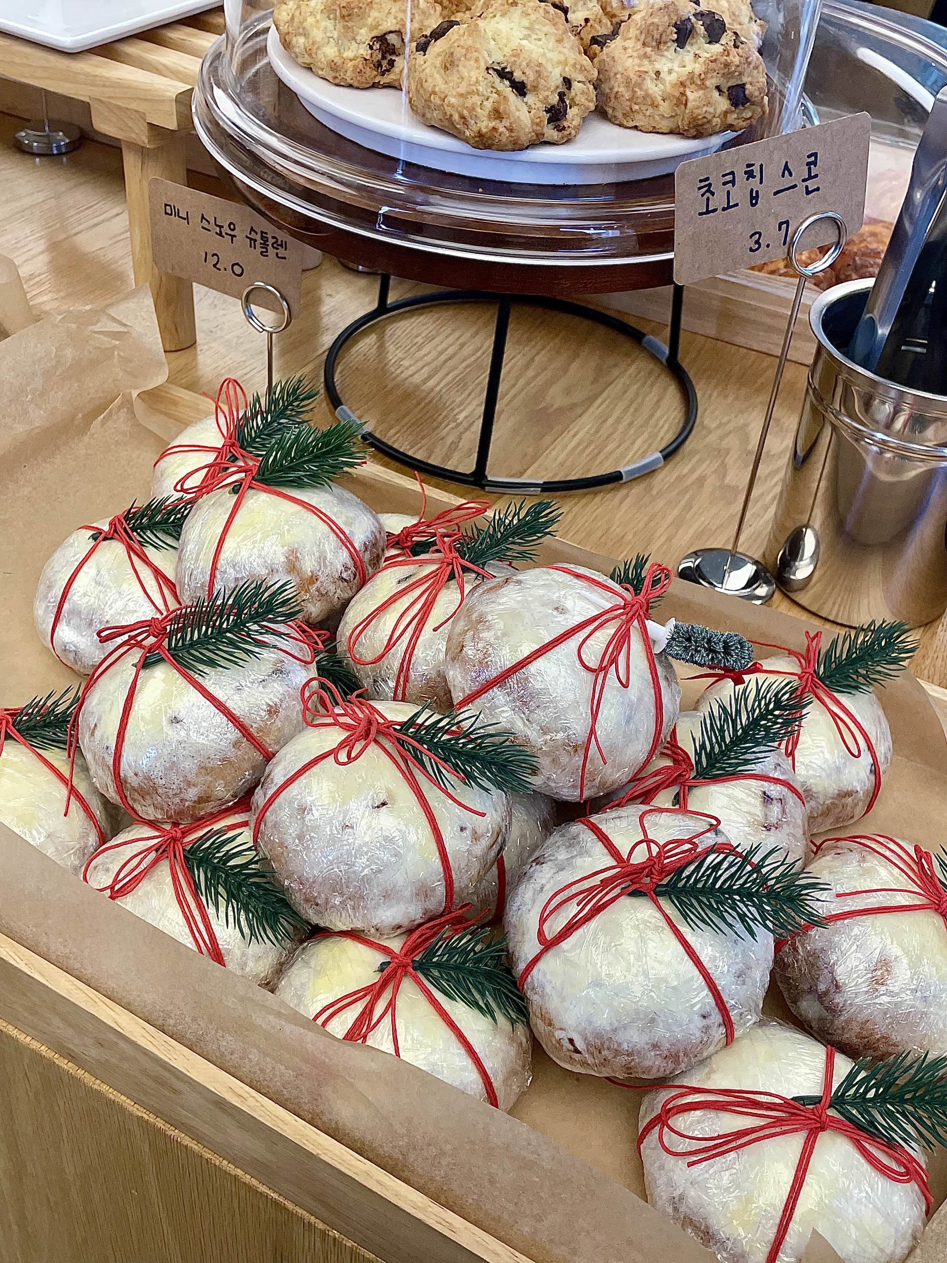 미니 스노우 슈톨렌 잎사귀와 빨간 리본으로 크리스마스 포인트가 돼요 :-)